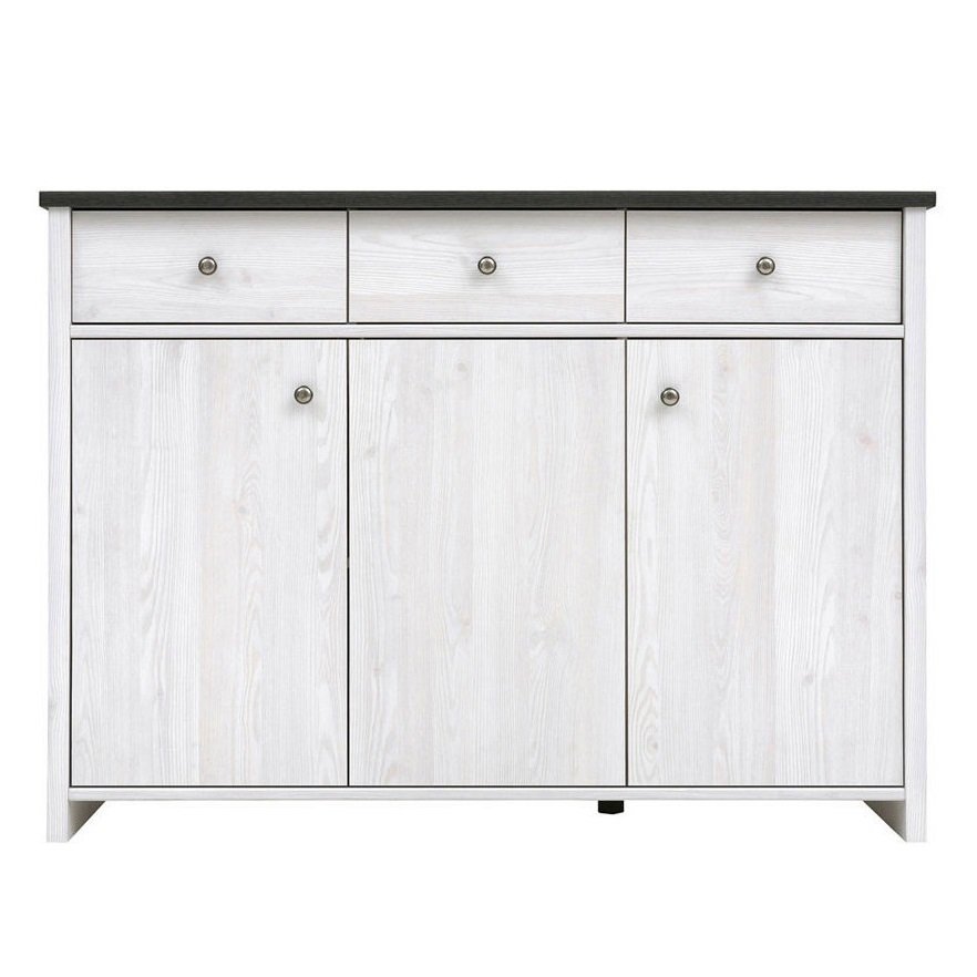 Комод содержит три выдвижных ящика и два закрытых отделения с полкой в каждом. Оборудован небольшими круглыми металлическими ручками серебристого цвета.
