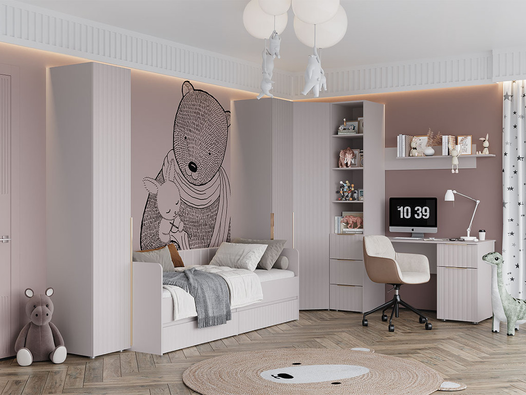 - Декор: Фрезеровка на фасадах, спинках кроватей, царгах