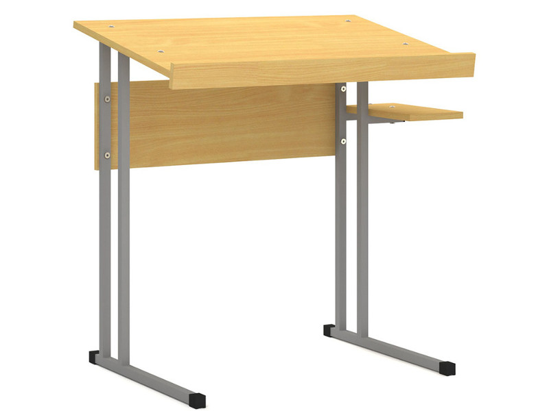 Стол ученический не регулируемый по высоте имеет наклонную столешницу, что служит важным подспорьем в учебном процессе. Его конструкция рассчитана в соответствии с эргономичными требованиями, благодаря чему заниматься за ним удобно и комфортно. Каркас изготовлен из металлической трубы квадратного сечения 20х20 мм, с полимерно-порошковой окраской в светло-серый цвет, имеет 2 крючка.