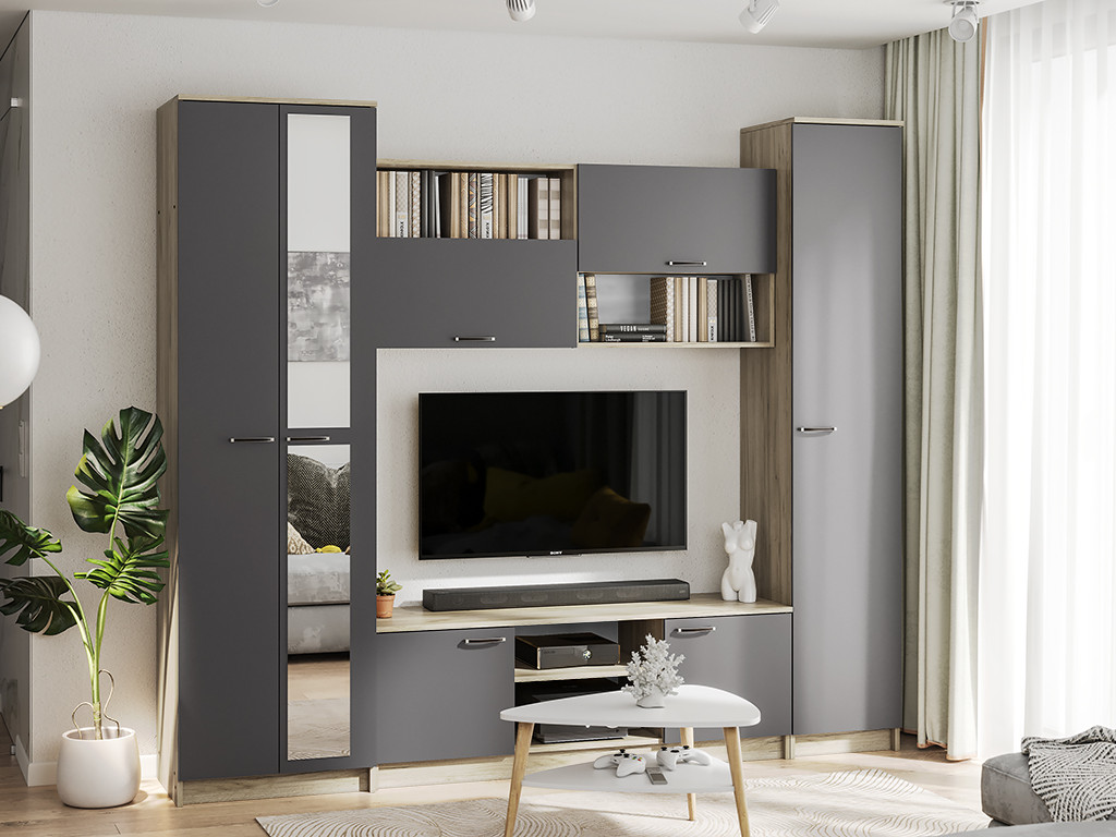 Гостиная состоит из бельевого шкафа, средней секции и платяного шкафа