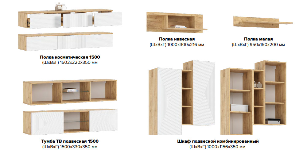 Цена за комплект: Тумба ТВ подвесная, Шкаф подвесной комбинированный, Полка навесная
