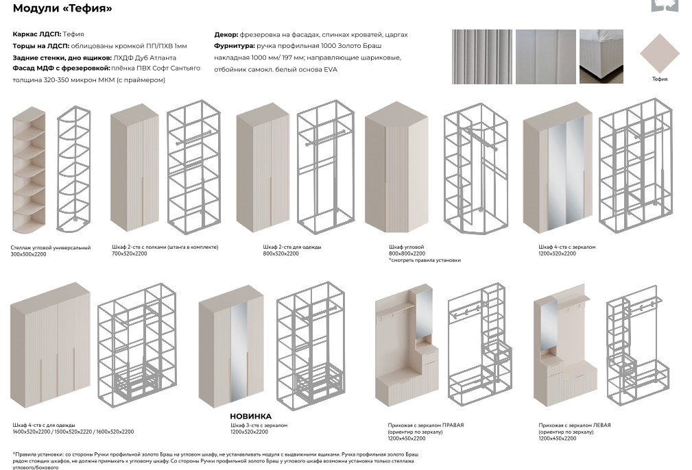 - Фасад: МДФ с фрезеровкой, плёнка ПВХ Софт Сантьяго, толщина 320-350 микрон МКМ (с праймером)