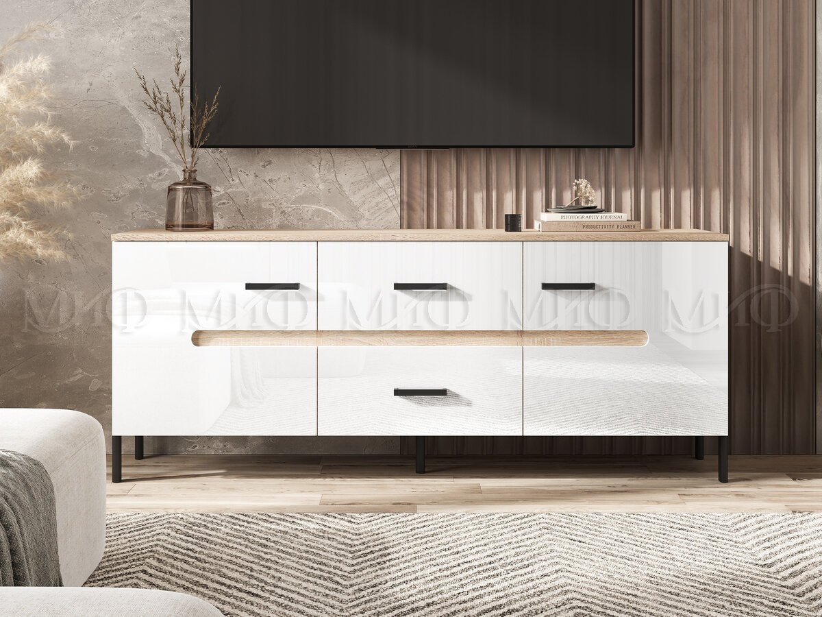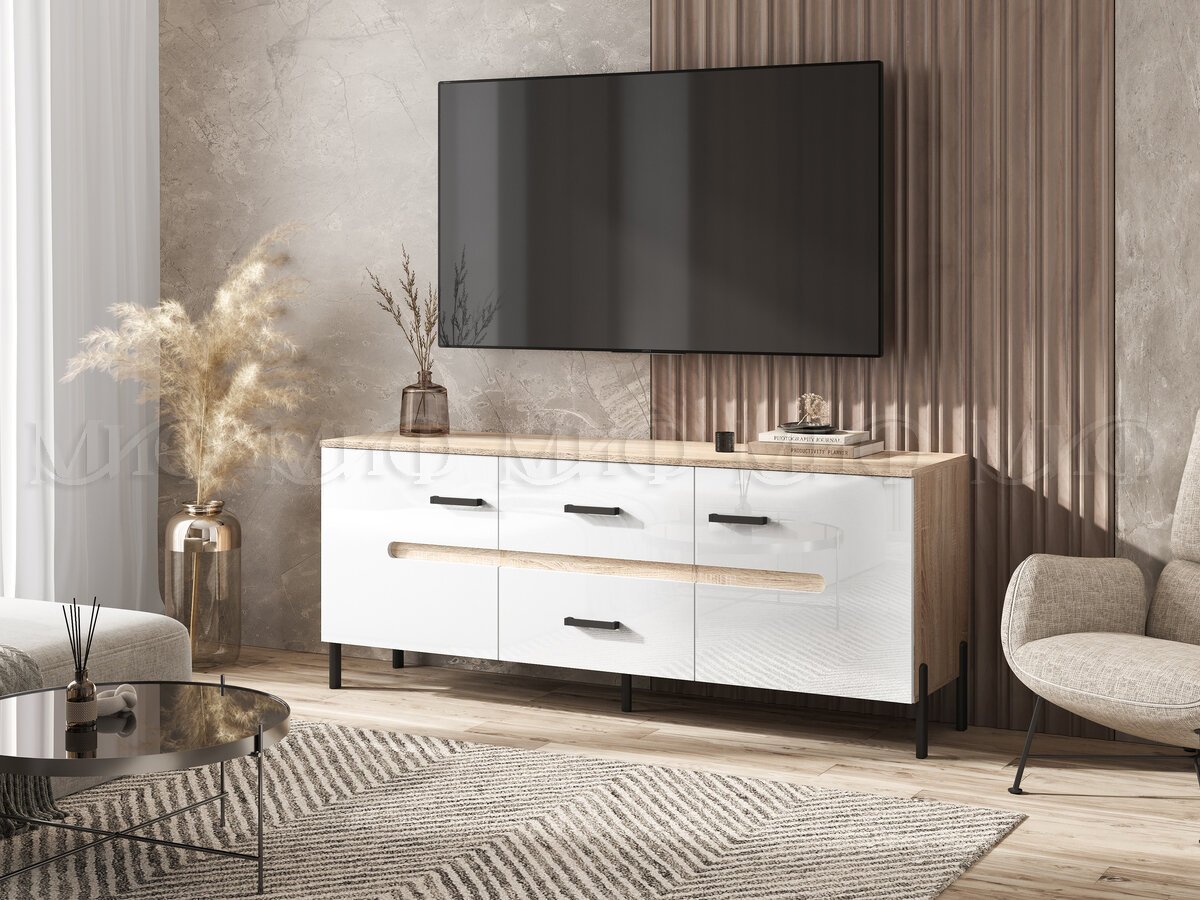 - Тумба ТВ (металл) Ким Белый Глянец, Дуб Сонома
