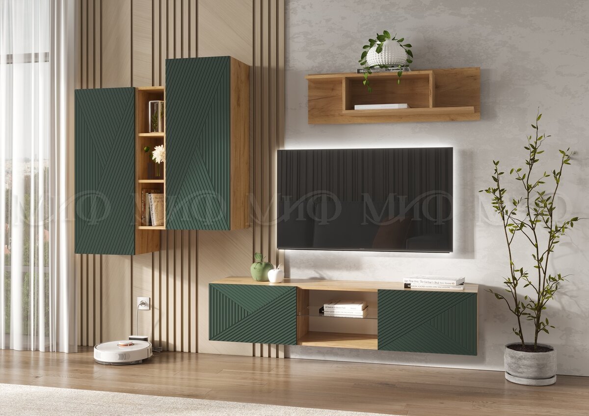 - Тумба ТВ подвесная 1500 Флэш Браш Мени Грин, Дуб Крафт