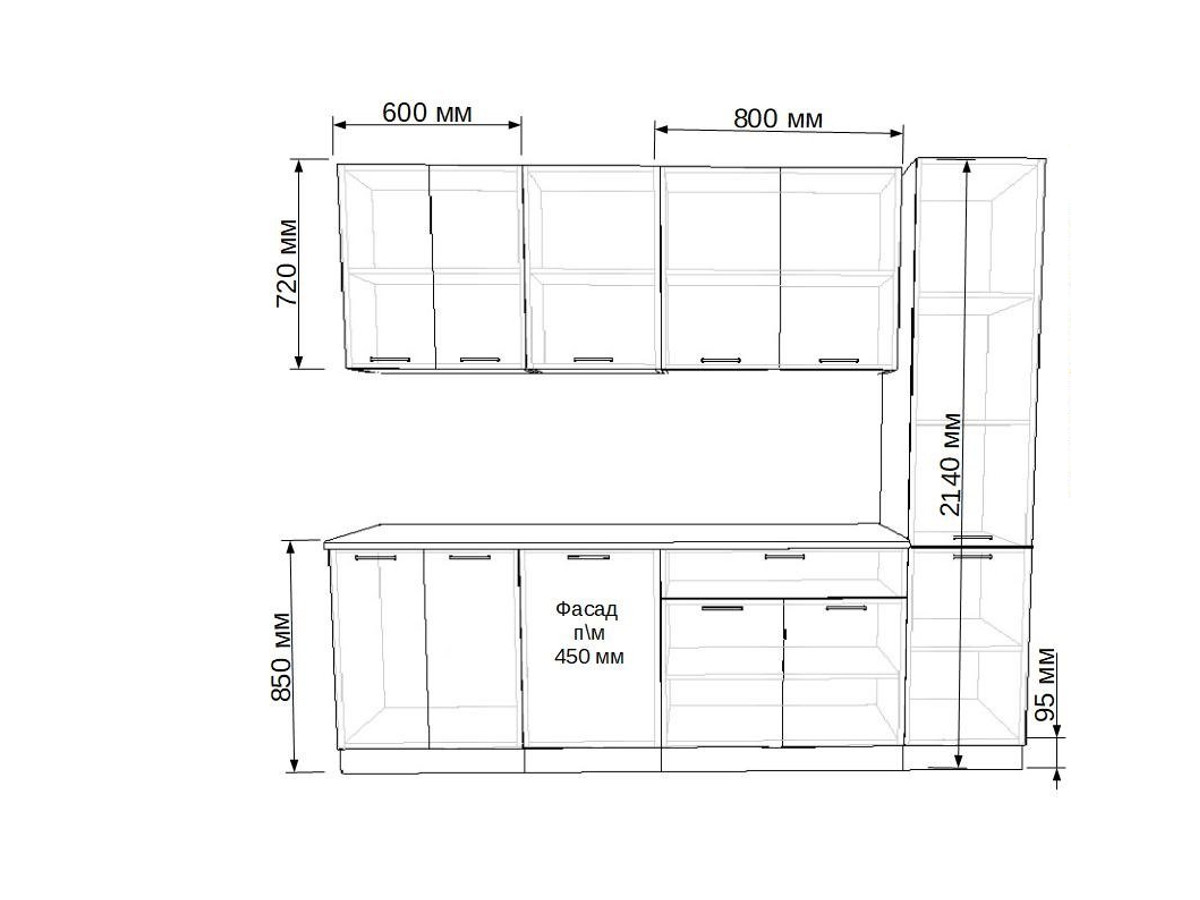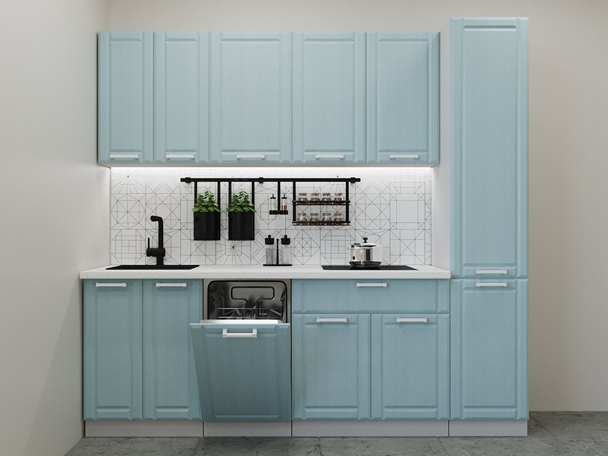 Кухонная мойка, стеновая панель, посудосушитель, планки для столешницы в комплект не входят.