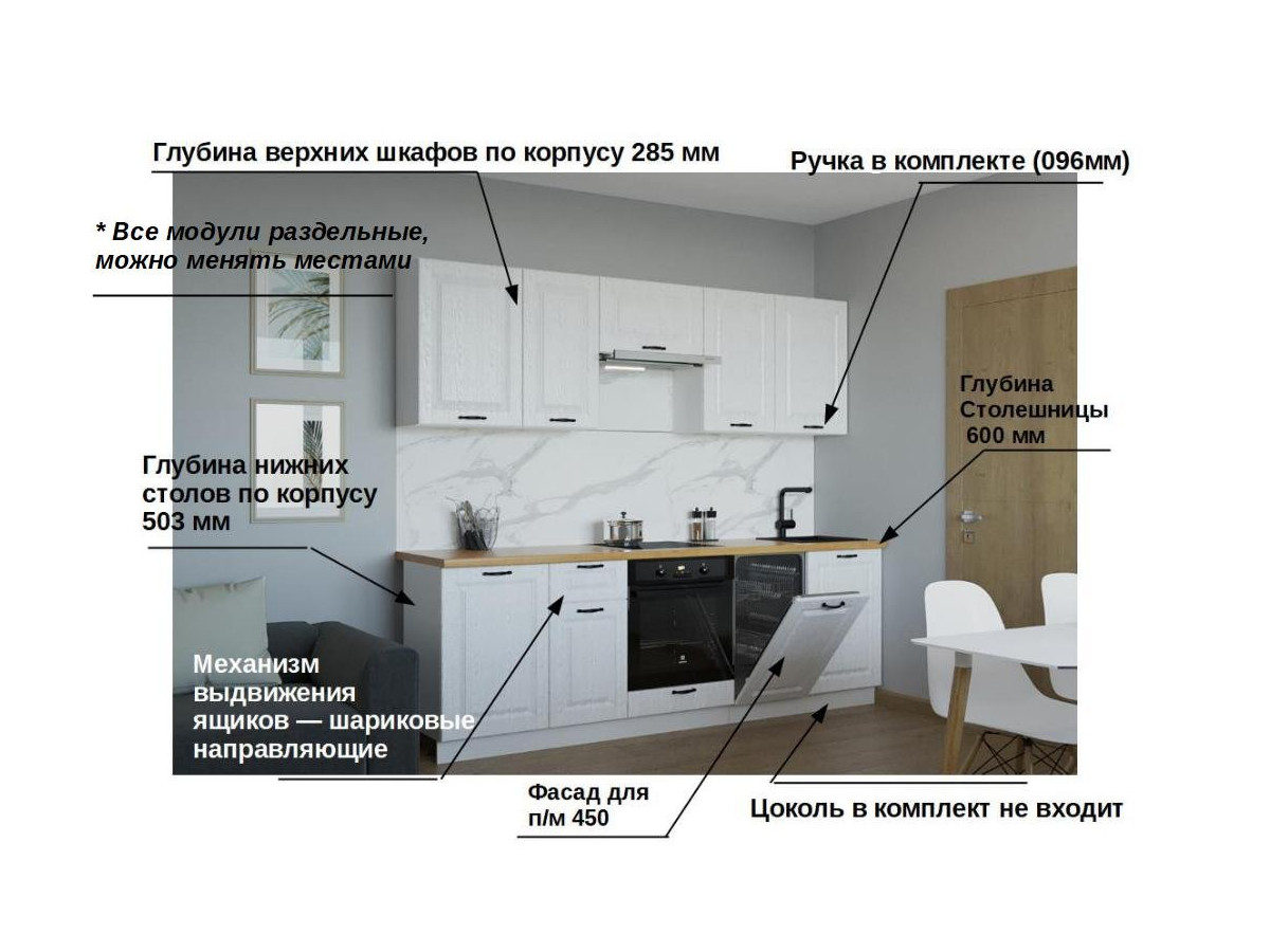 Кухонная мойка, стеновая панель, посудосушитель, планки для столешницы в комплект не входят.