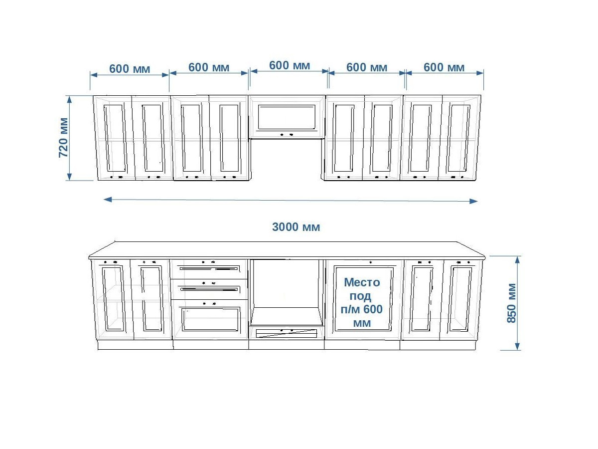Кухонная мойка, стеновая панель, посудосушитель, планки для столешницы в комплект не входят.