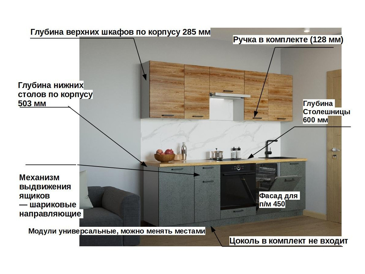 Кухонная мойка, стеновая панель, посудосушитель, планки для столешницы в комплект не входят.