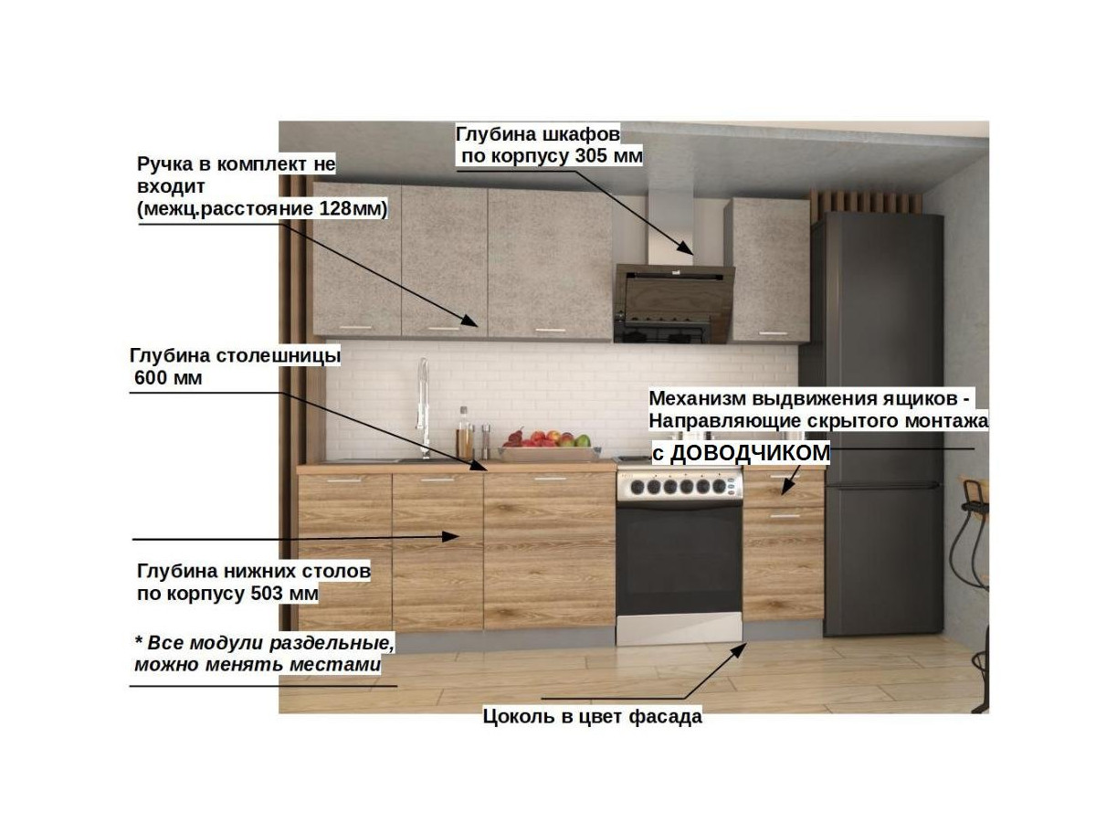 Кухонная мойка, стеновая панель, посудосушитель, планки для столешницы в комплект не входят.