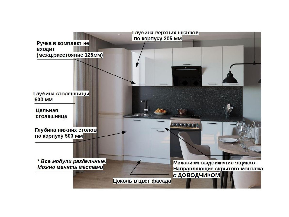 Кухонная мойка, стеновая панель, посудосушитель, планки для столешницы в комплект не входят.