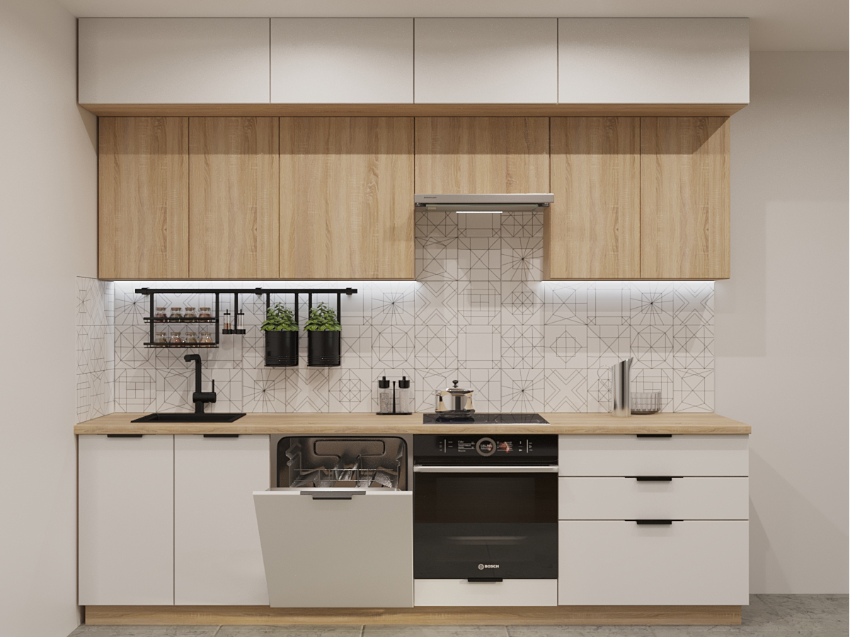 Кухонная мойка, стеновая панель, посудосушитель, планки для столешницы в комплект не входят.