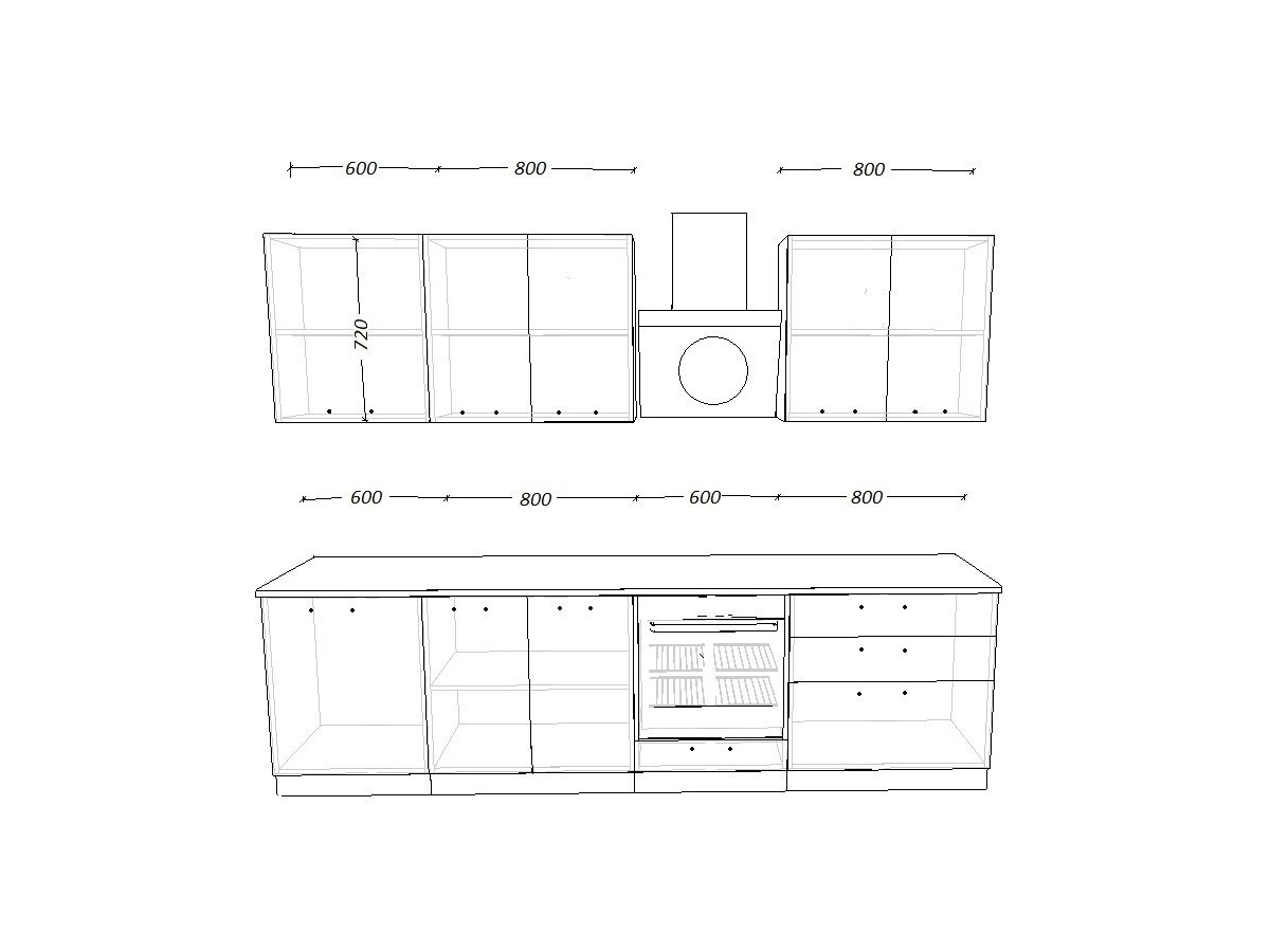 - высота верхних шкафов 720 мм