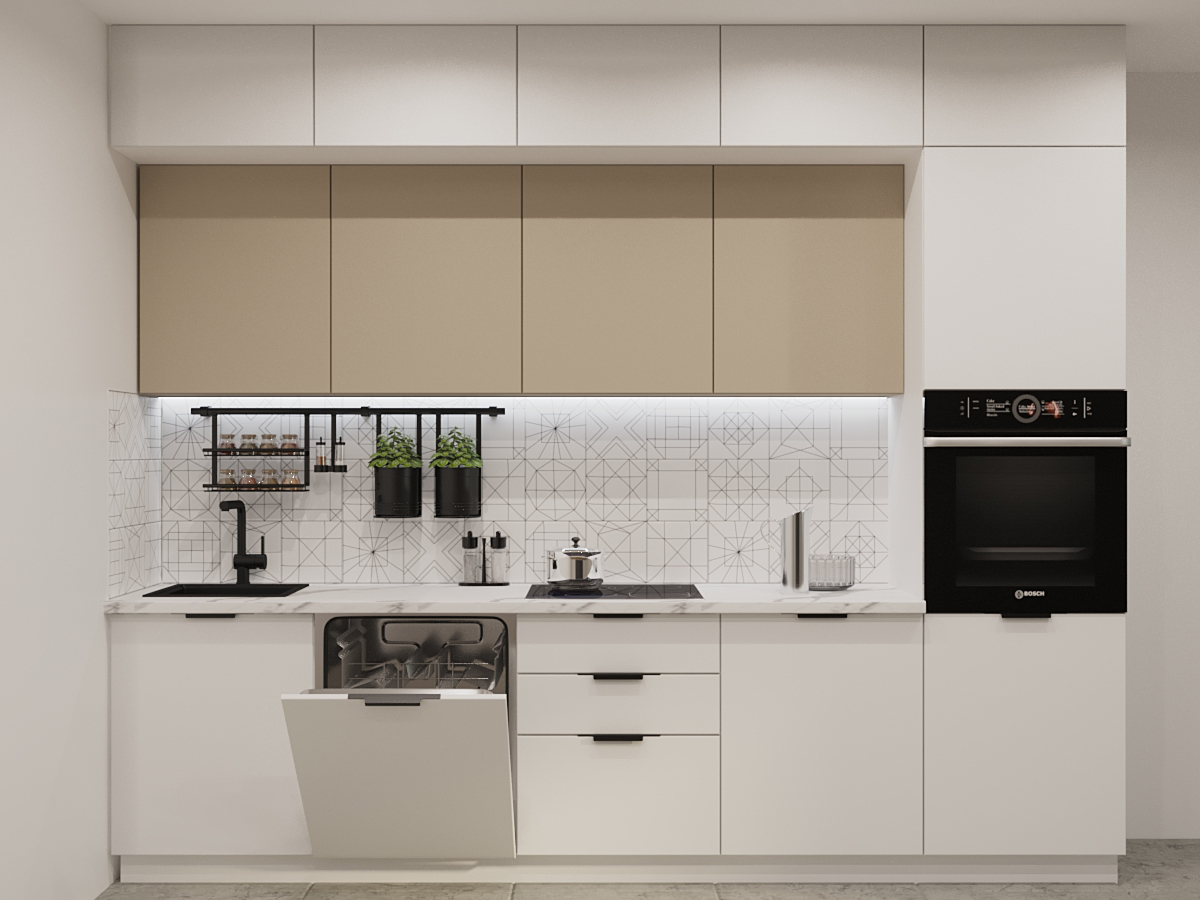 Кухонная мойка, стеновая панель, посудосушитель, планки для столешницы в комплект не входят.