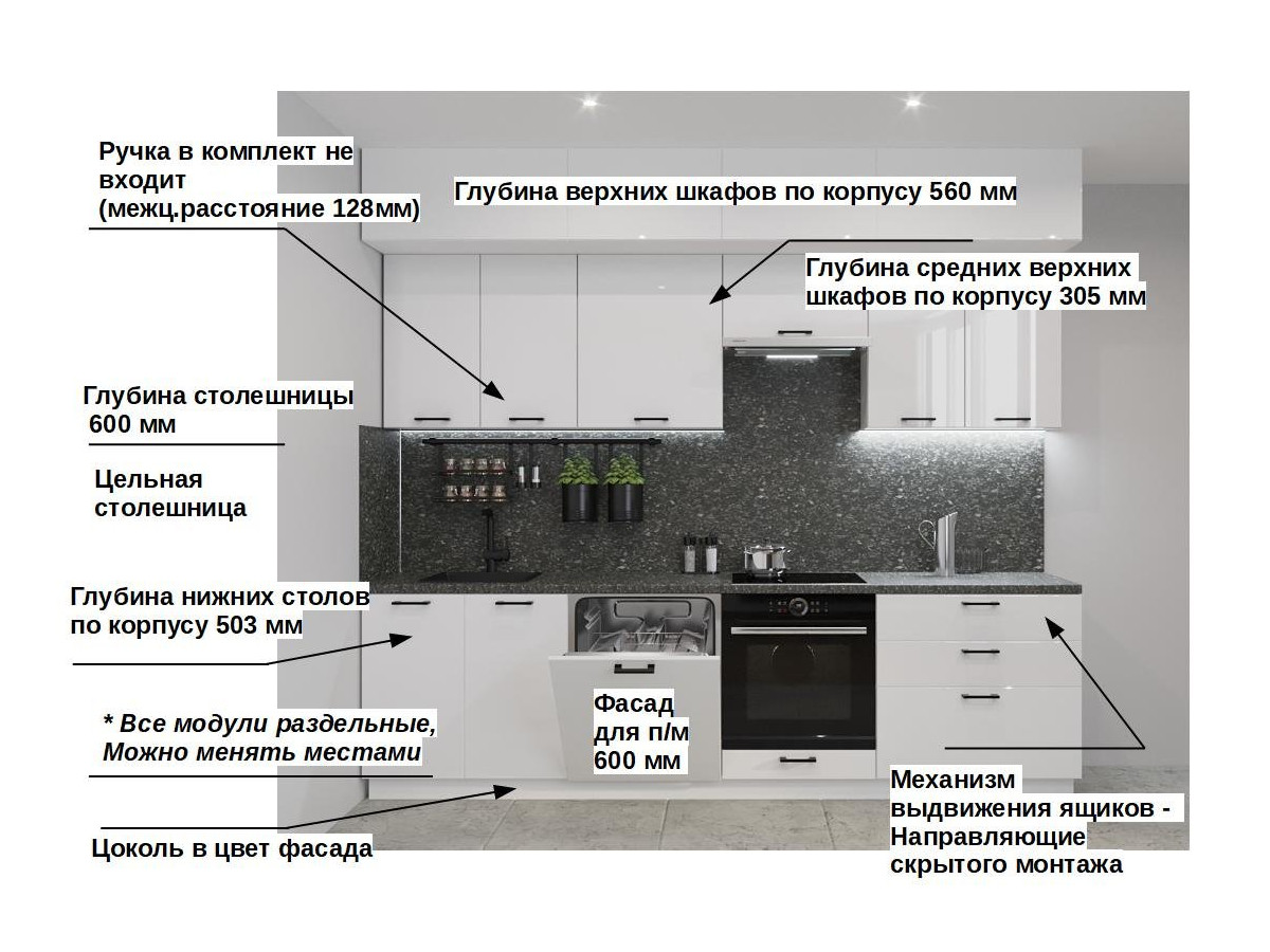 Кухонная мойка, стеновая панель, посудосушитель, планки для столешницы в комплект не входят.