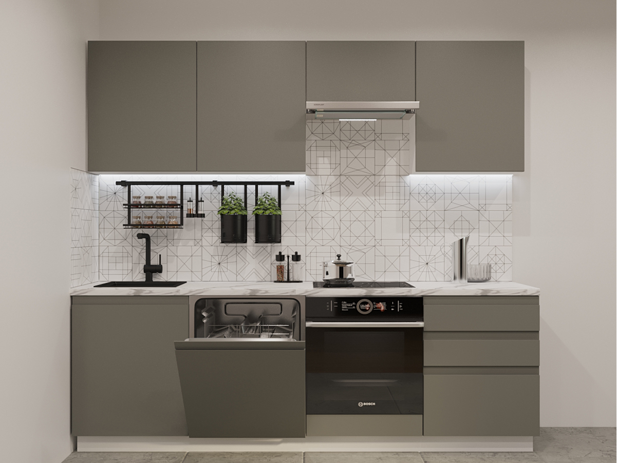 Кухонная мойка, стеновая панель, посудосушитель, планки для столешницы в комплект не входят.