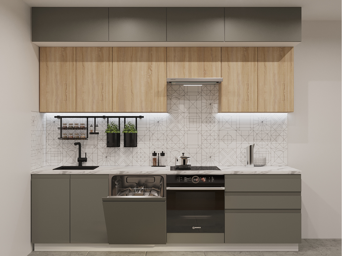 Кухонная мойка, стеновая панель, посудосушитель, планки для столешницы в комплект не входят.