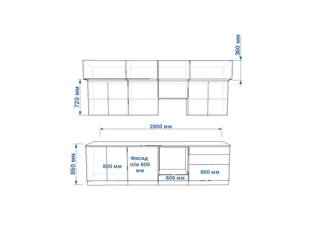 - высота верхних шкафов 720 мм