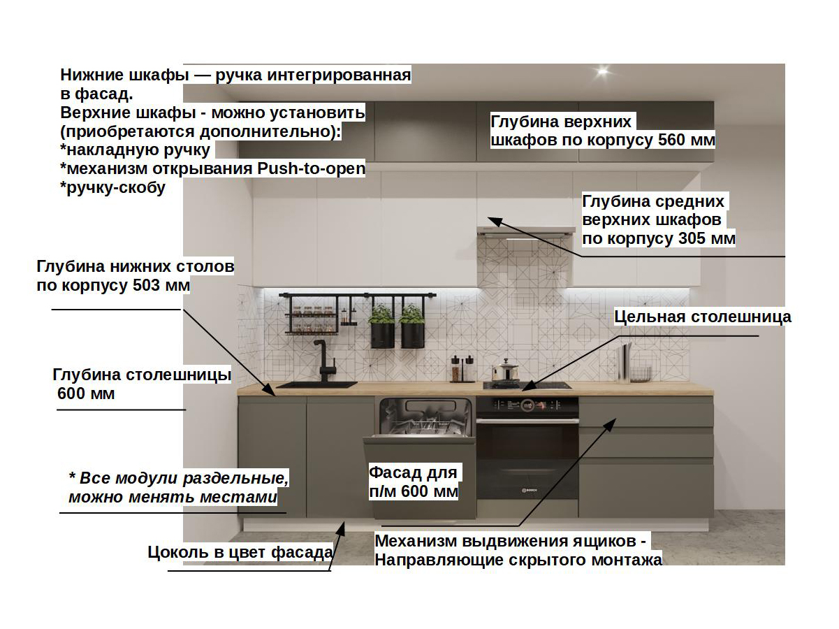 Кухонная мойка, стеновая панель, посудосушитель, планки для столешницы в комплект не входят.