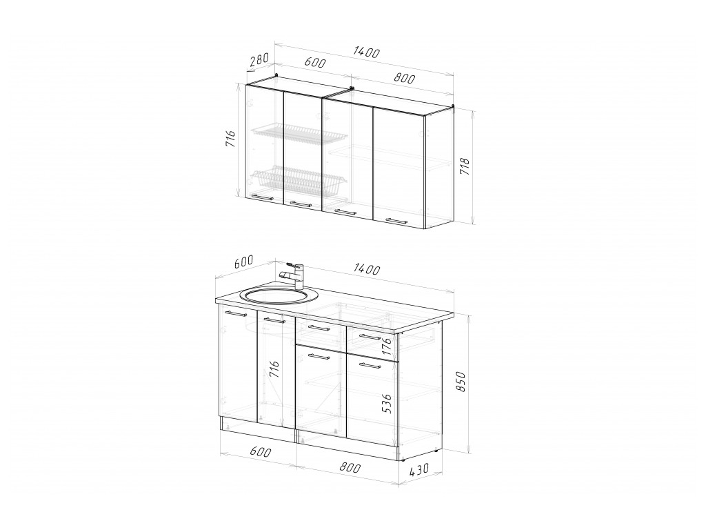 Мойка, смеситель, стеновая панель и посудосушитель в комплект гарнитура не входят.