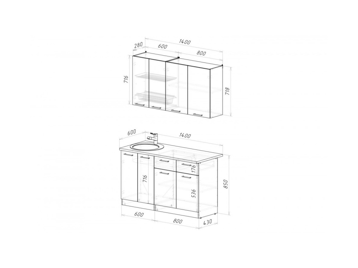Мойка, смеситель, стеновая панель и посудосушитель в комплект гарнитура не входят.