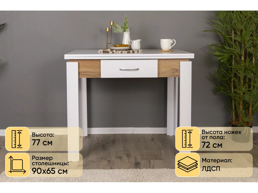 Стол обеденный Doma раскладной с ящиком Белый бриллиант/Дуб вотан