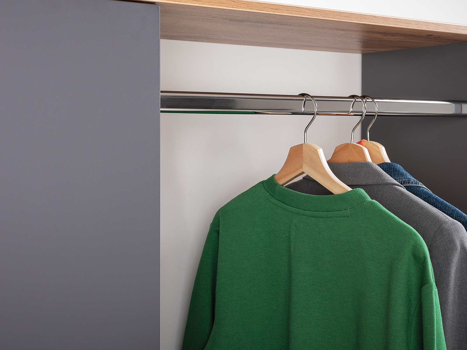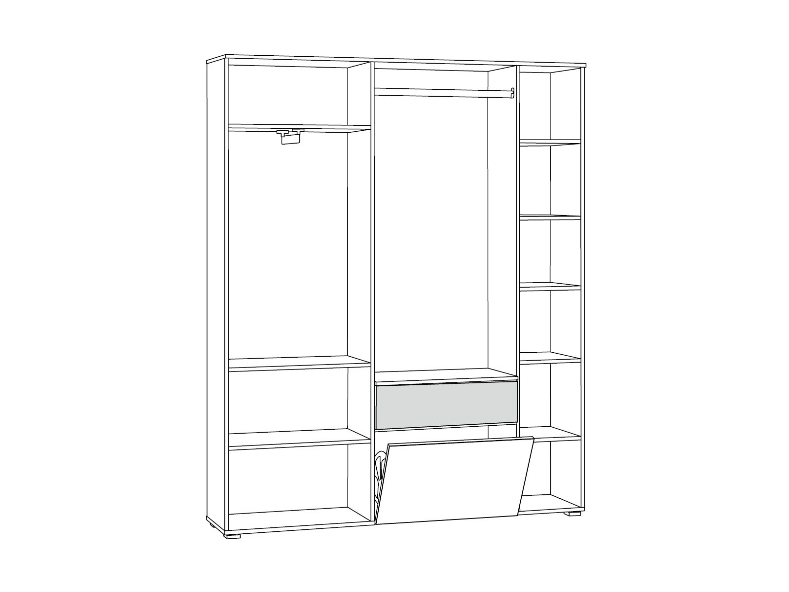 Фурнитура: Шариковые направляющие полного выдвижения, алюминиевые ручки, выдвижная вешалка