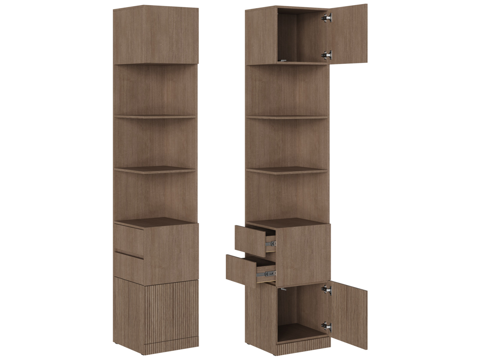 Четвертая часть расположена внизу стеллажа. Габарит отсека Д.418 х В.368 х Г.426 мм. Видимая боковина и створка из ЛДСП в цвет фасада. Фасад открывается при помощи отталкивателя.