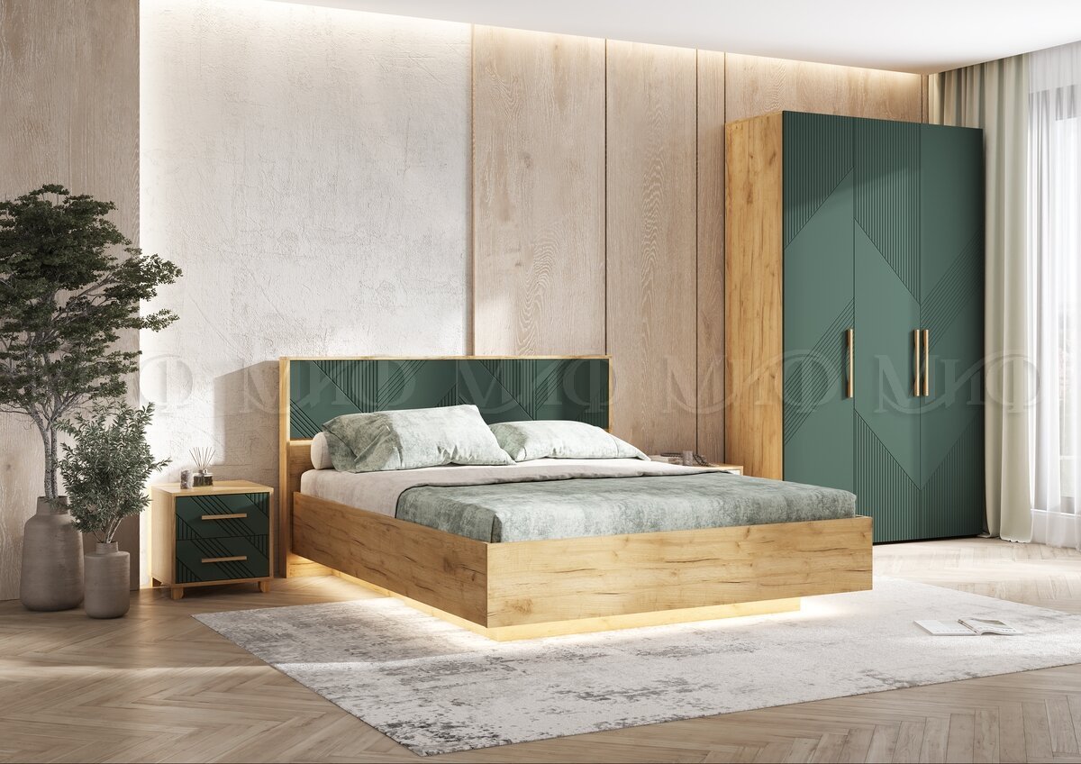 - Кровать парящая 1600 Ирис (ортопед металл) Браш Мени Грин/Дуб Крафт