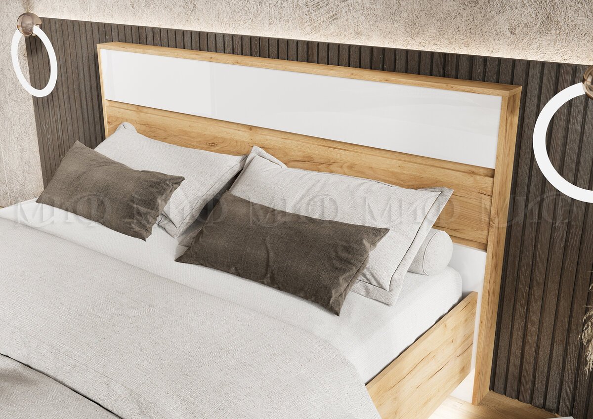 - Кровать парящая 1600 Роджина (ортопед металл) Белый глянец холодный/Дуб Крафт