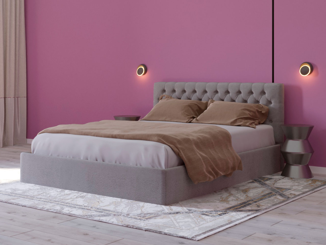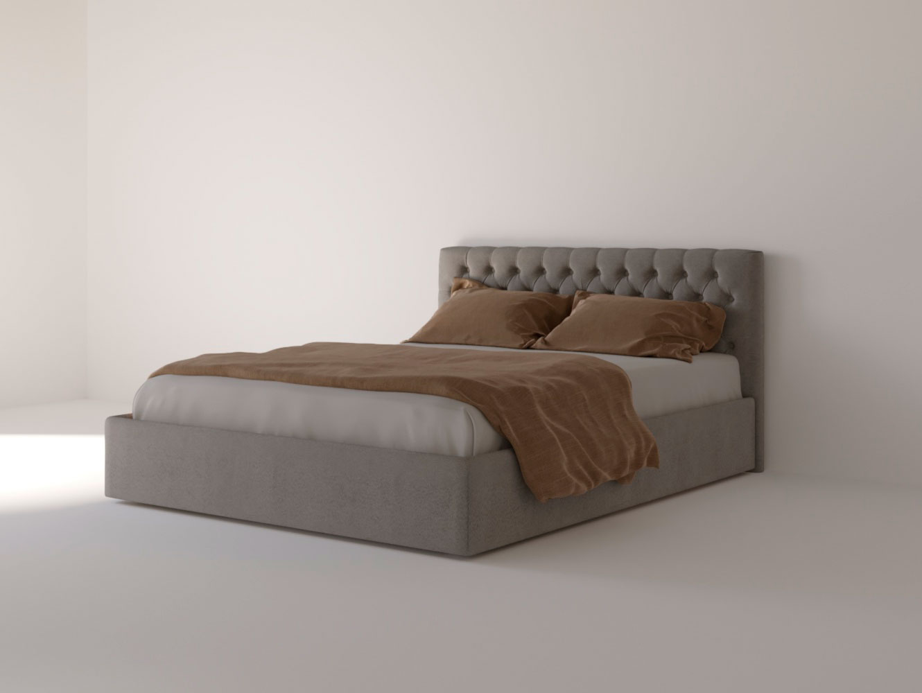 Изголовье: Изголовье оформлено с эффектом каретной стяжки, что создает эффектный акцент в дизайне. Этот элемент не только эстетичен, но и функционален, обеспечивая поддержку во время чтения или отдыха.