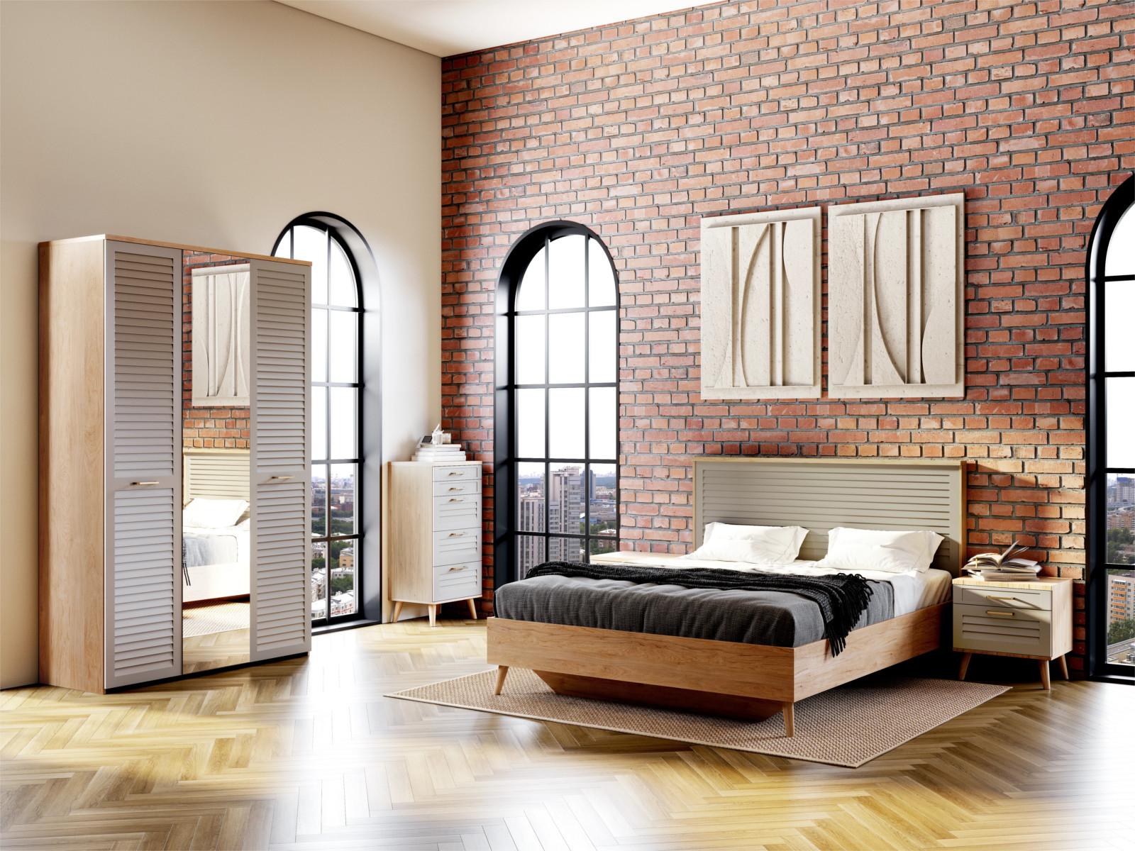 Цена за комплект: шкаф 3 двери,комод 5 ящика, кровать, тумба