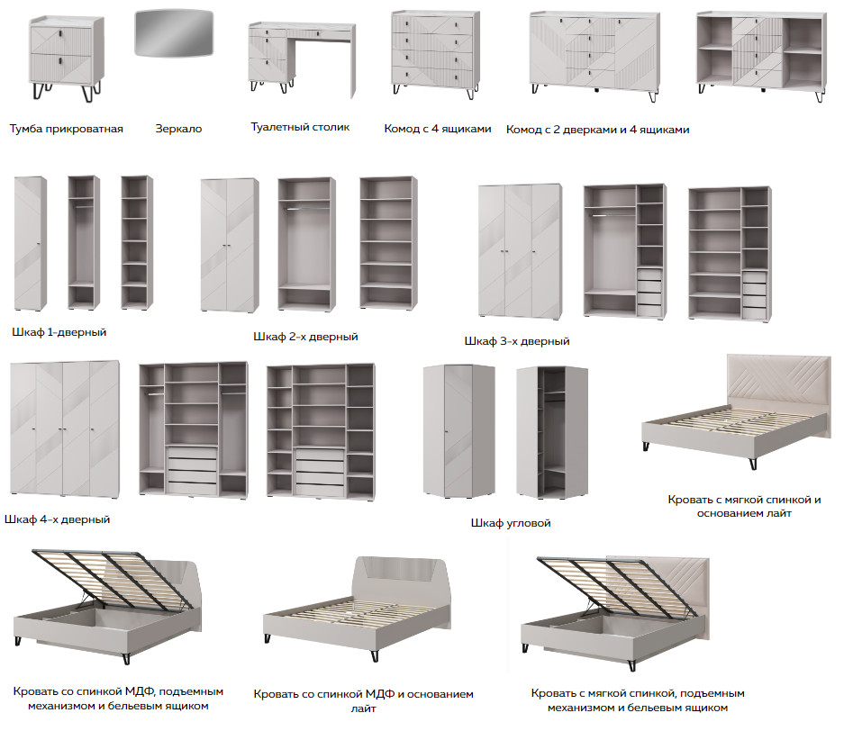 Цена за комплект: Зеркало, Туалетный столик, Тумба прикроватная (2шт), Шкаф 3х дверный, Кровать 1400 спинка МДФ, Основание для кровати ЛАЙТ 1400
