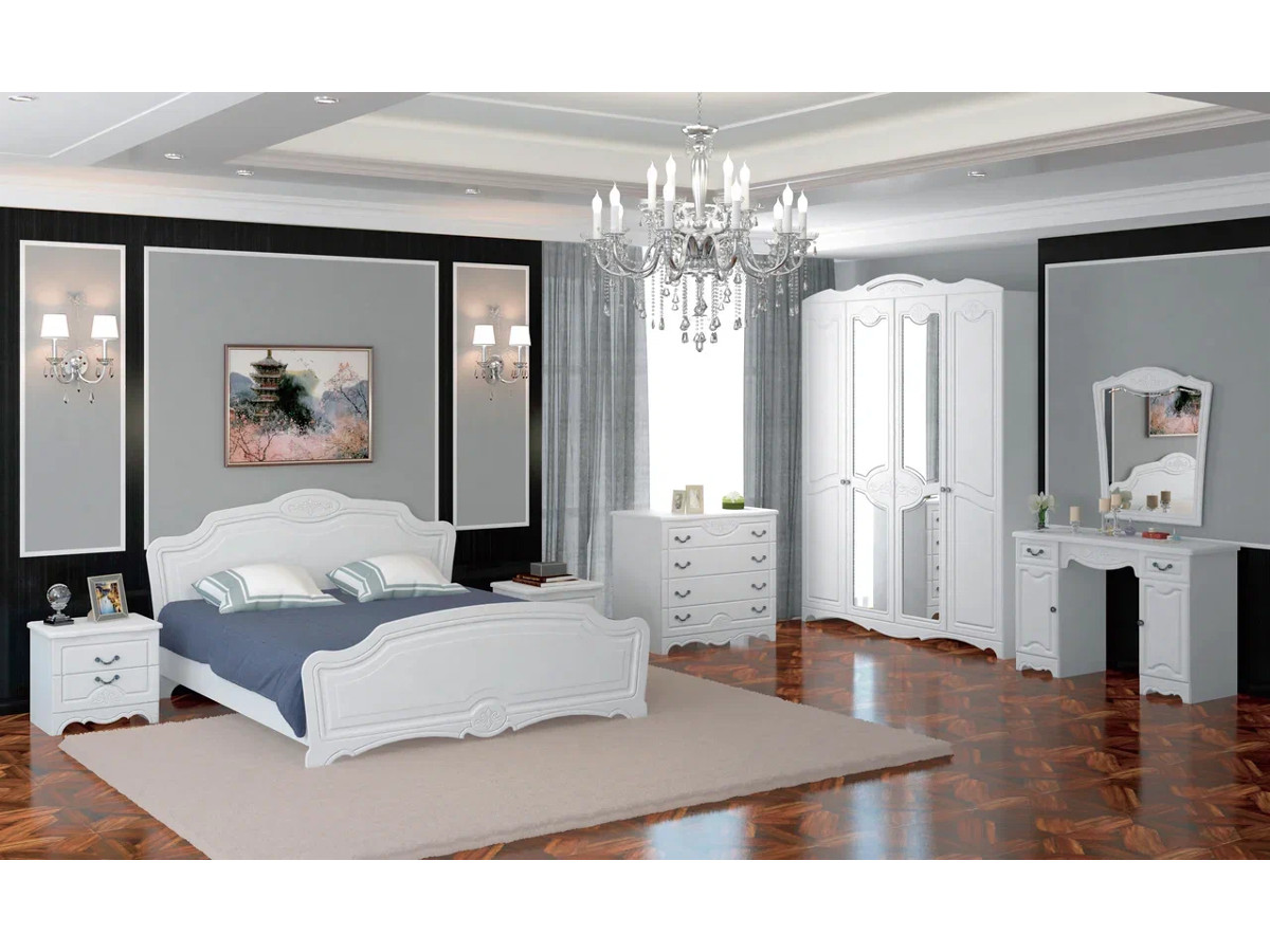 Цена за комплект: зеркало навесное, туалетный (макияжный) стол, комод 4 ящика, ШР-4 шкаф для платья и белья, тумба прикроватная (2 шт), кровать двойная 1400, опора с гибким основанием ЮР 48-03-1400 + ножки