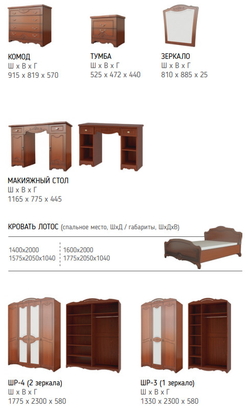 Цена за комплект: зеркало навесное, туалетный (макияжный) стол, комод 4 ящика, ШР-4 шкаф для платья и белья, тумба прикроватная (2 шт), кровать двойная 1400, опора с гибким основанием ЮР 48-03-1400 + ножки