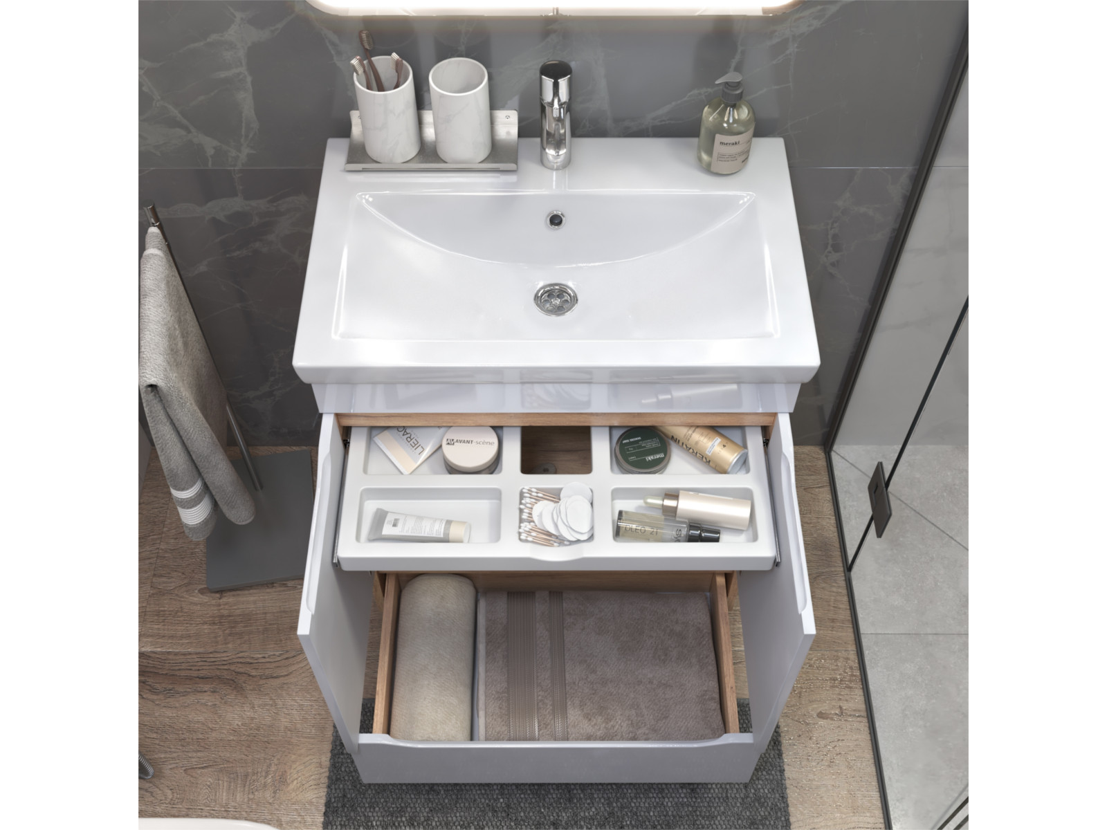 Оснащение: 2 дверцы, петли с механизмом доводчика, 1 ящик, выдвижной органайзер для мелочей, шариковые направляющие полного выдвижения, 2 опоры квадратные регулируемые; 2 кухонные опоры