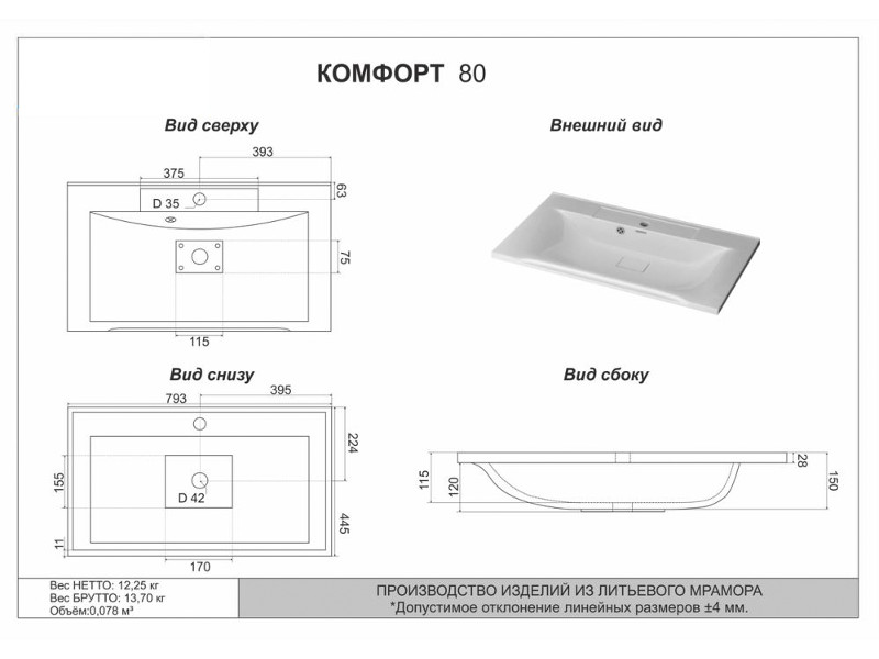 - Тумба Рица 80 подвесная 1 ящик, ниша раковина Комфорт 80 cерый/керамика