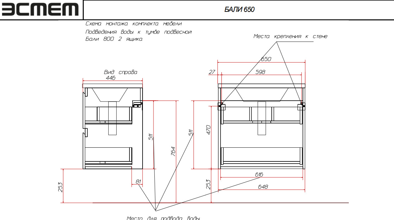- Тумба с раковиной Bali 650 навесная 2 ящика