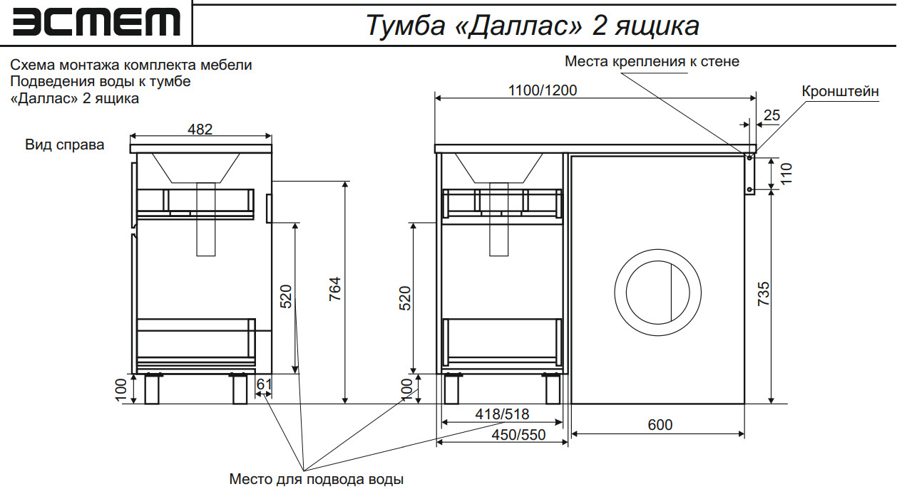 Тумба с раковиной Dallas Luxe 1200 напольная 2 ящика левая