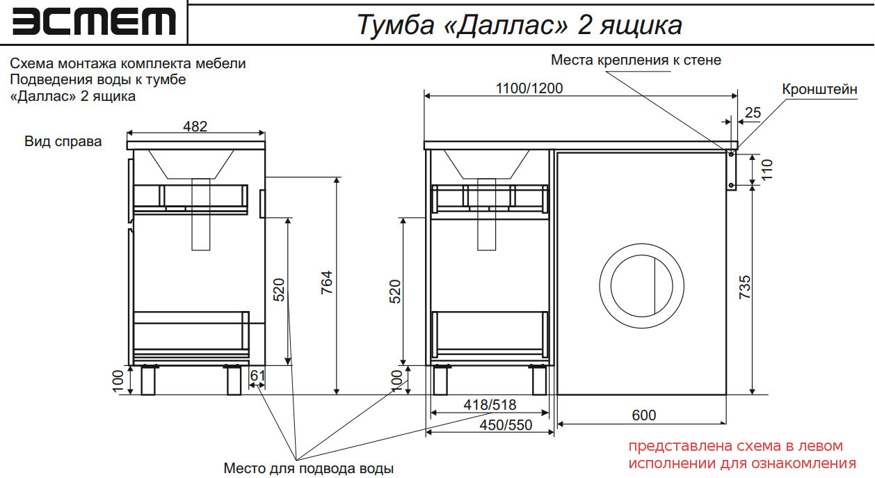 - Тумба с раковиной Dallas Luxe 1200 напольная 2 ящика правая