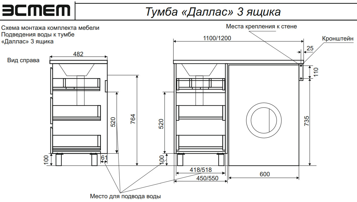 - Тумба с раковиной Dallas Luxe 1200 напольная 3 ящика левая