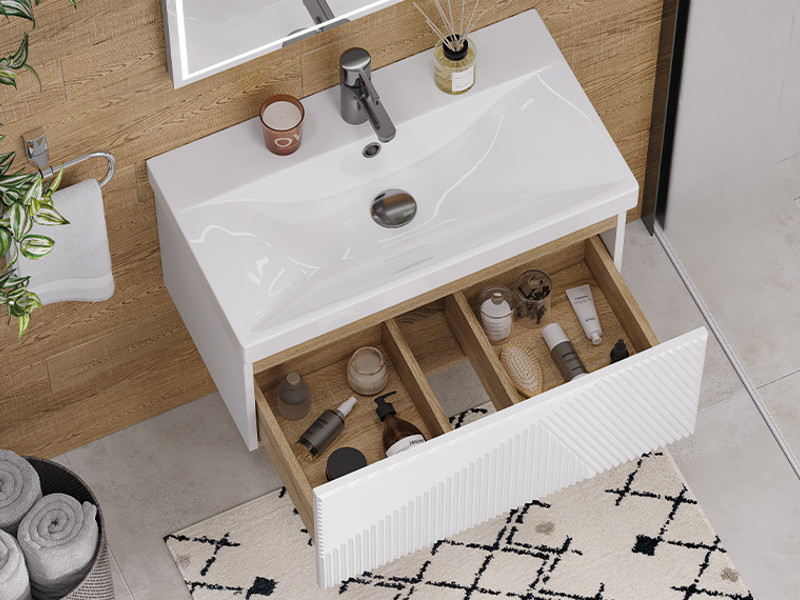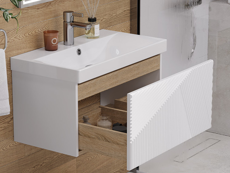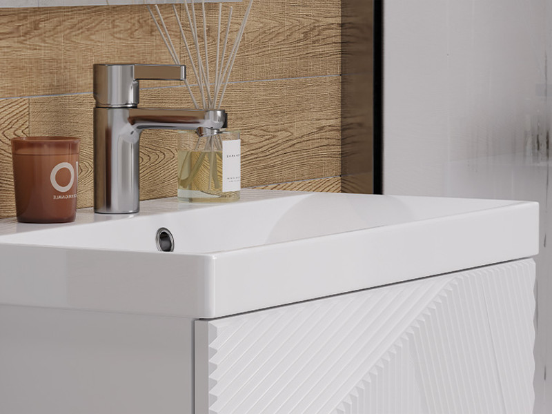 Материалы тумбы: МДФ, влагостойкая ЛДСП, полимерное покрытие ПВХ, врезная ручка, европейская фурнитура