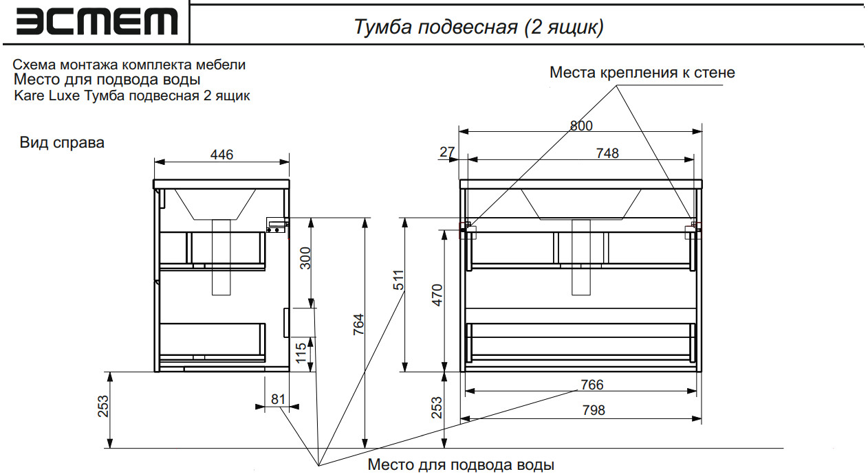 Тумба с раковиной Kare Luxe 800 навесная 2 ящика