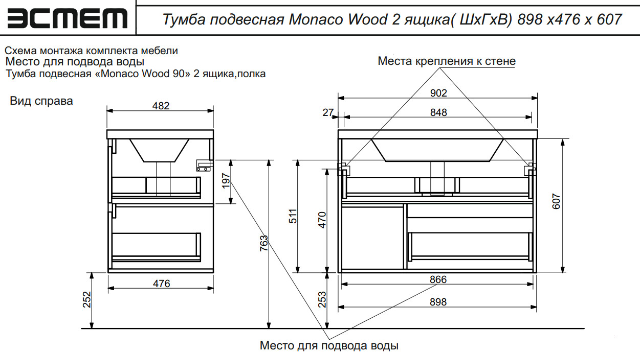 - Тумба с раковиной Monaco Wood 900 2 ящика с нишей