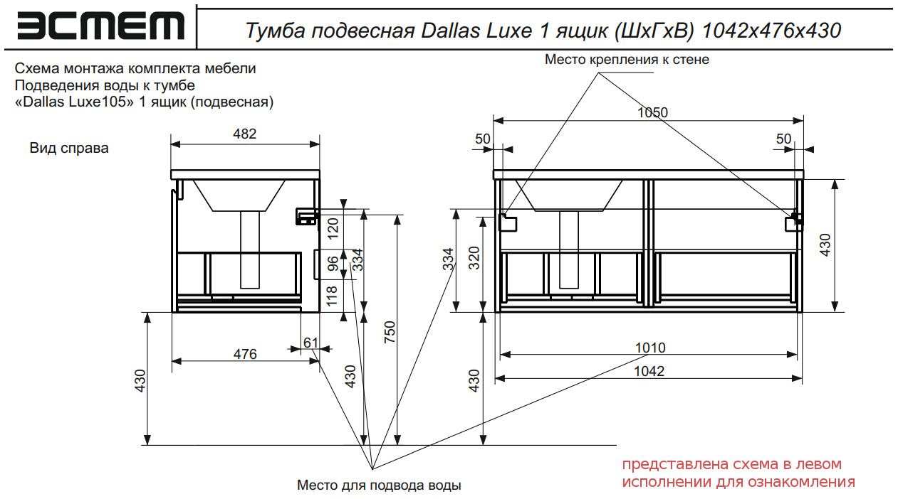 - Тумба с раковиной справа Dallas Luxe 1050 навесная 1 длинный ящик