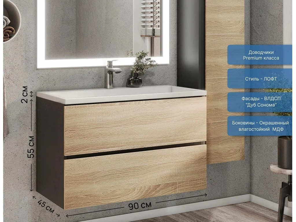Тумба с раковиной Uperwood Barsa 90 см раковина белая-тумба черная/дуб сонома