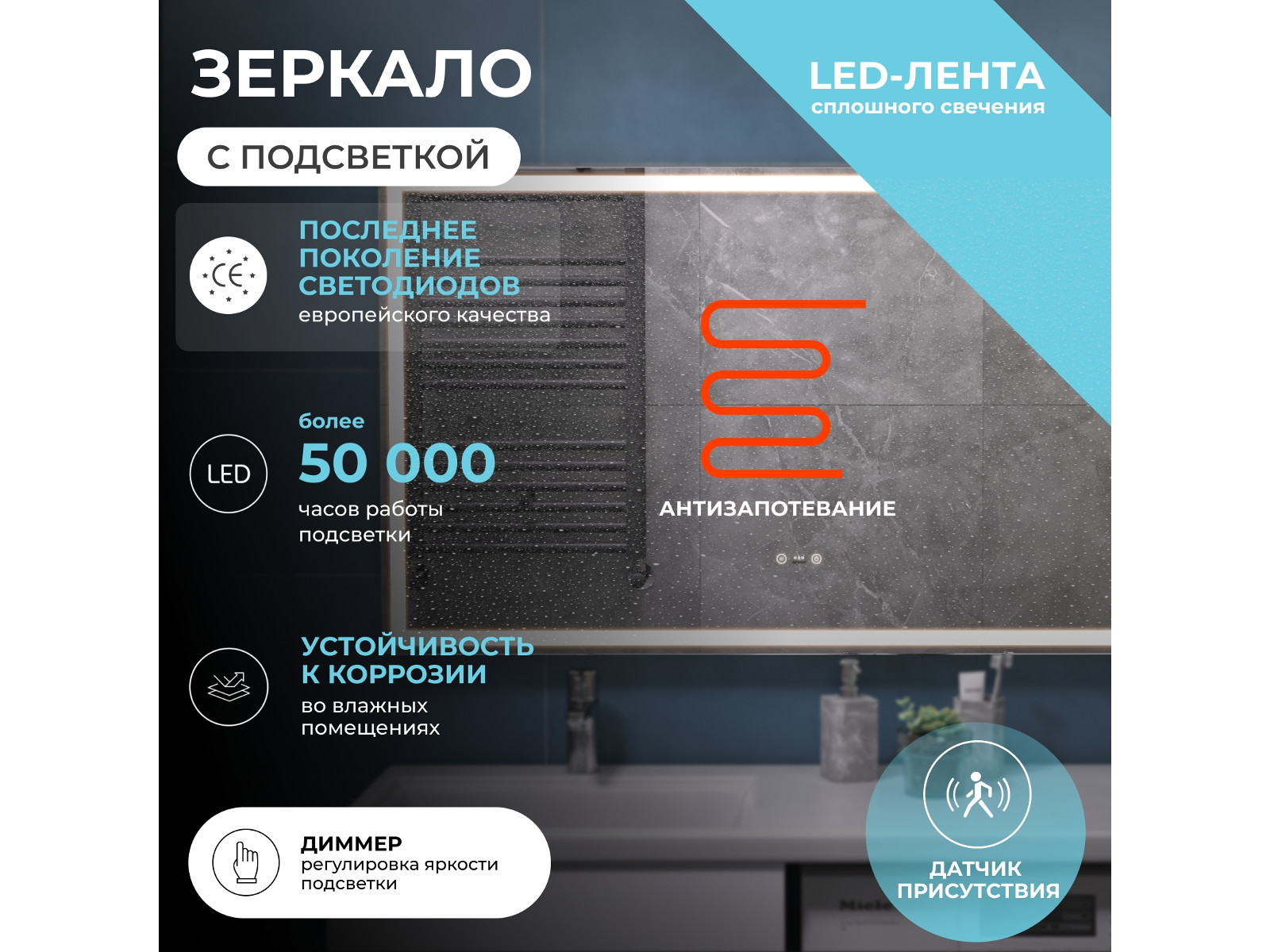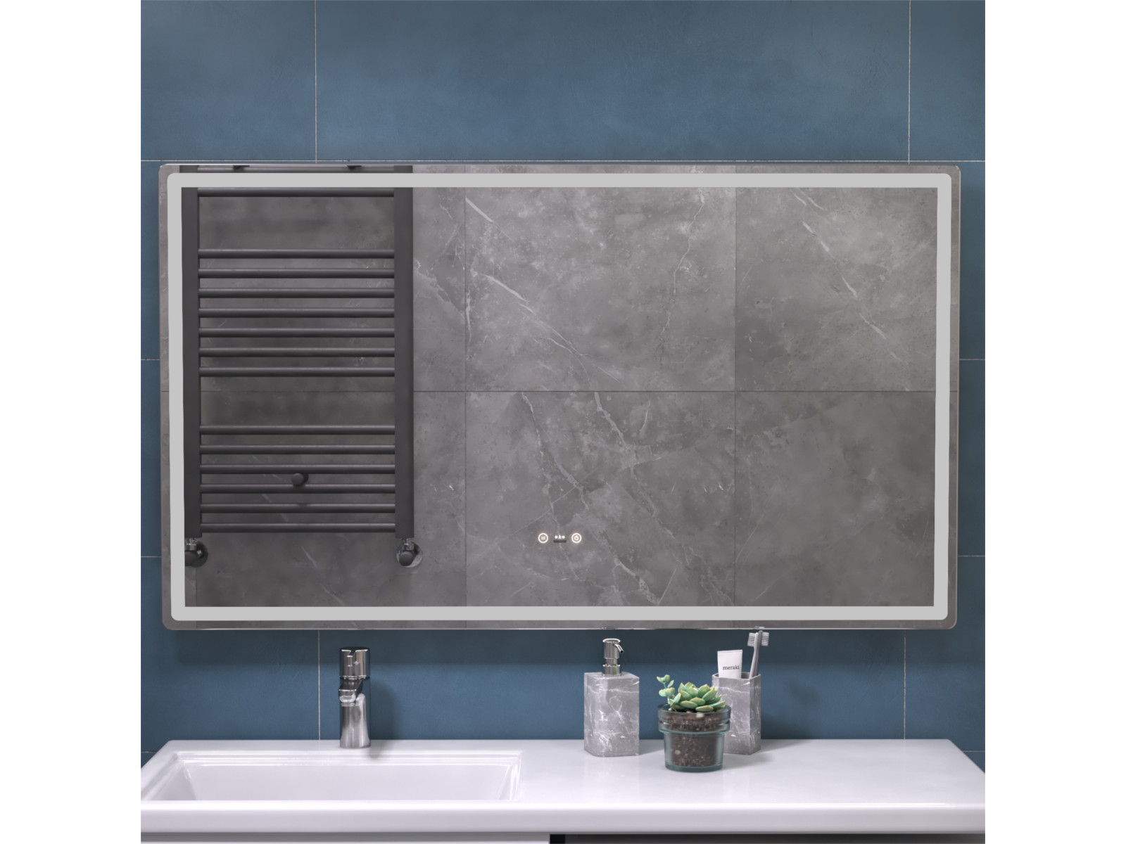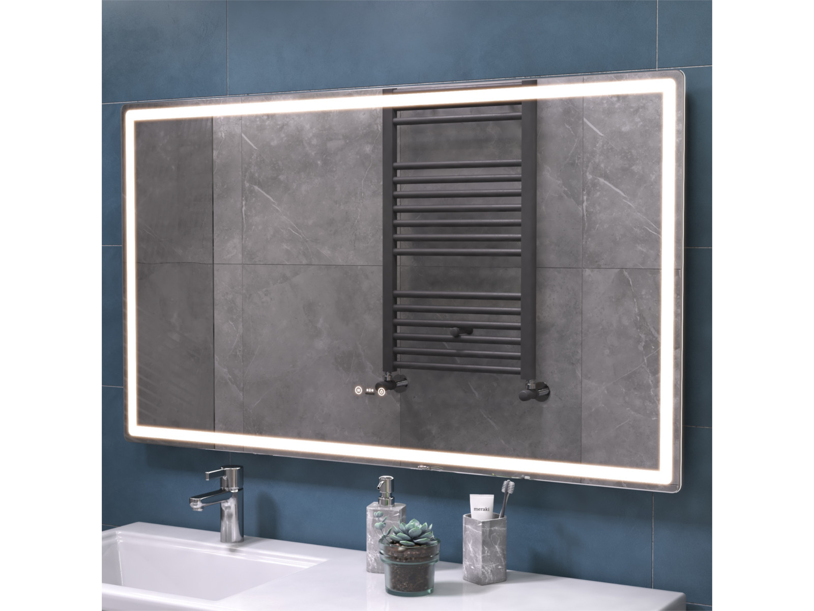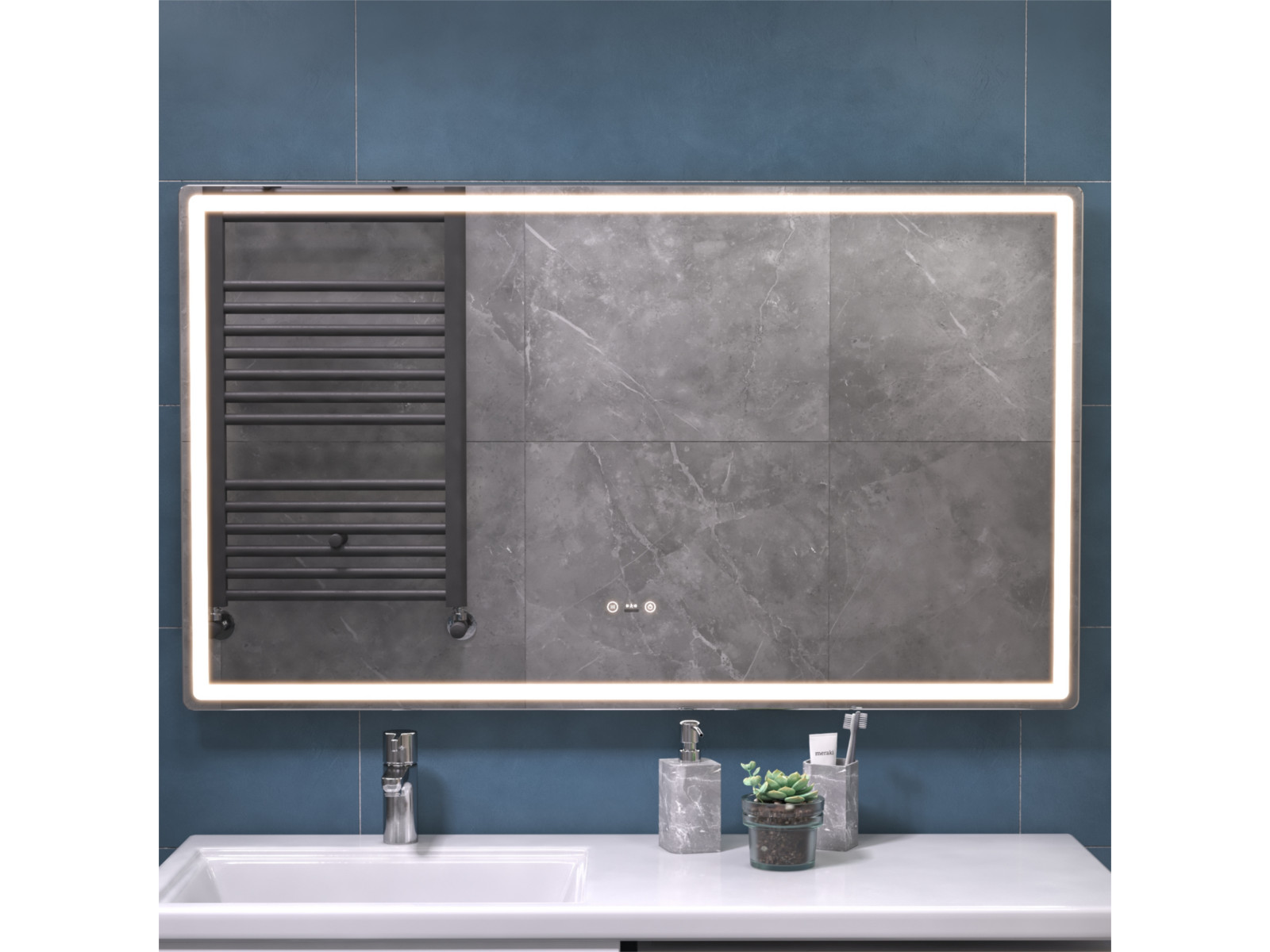 Подсветка фронтальная по периметру, с цветовой температурой 5000К – нейтральный белый, управление подсветкой сенсорное/датчик присутствия (1.5 м.)