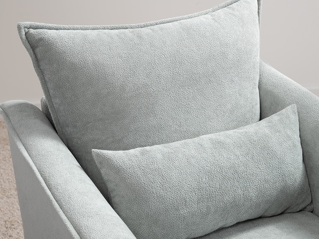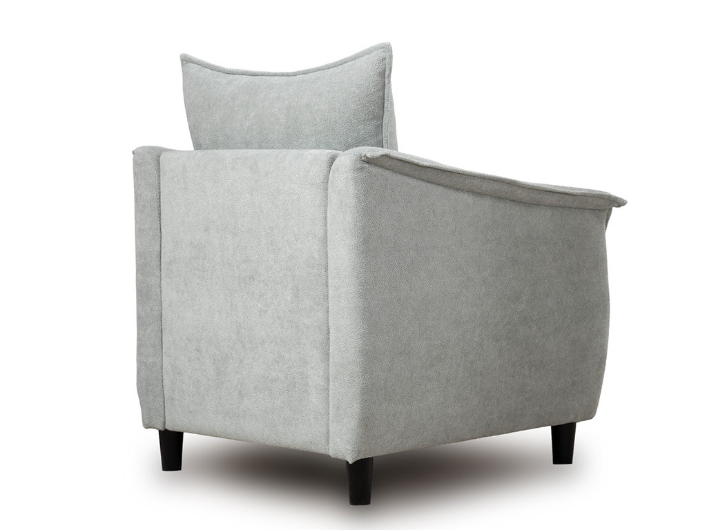Кресло с приспинной подушкой трапецивидной формы на молнии, по трем сторонам которой проложена отделочная строчка на 1,2 см. По контуру боковин проложен декоративный кант на 1,2 см основной ткани. Кант проходит по центру передней части боковины, а по внутренней верхней части сборка.