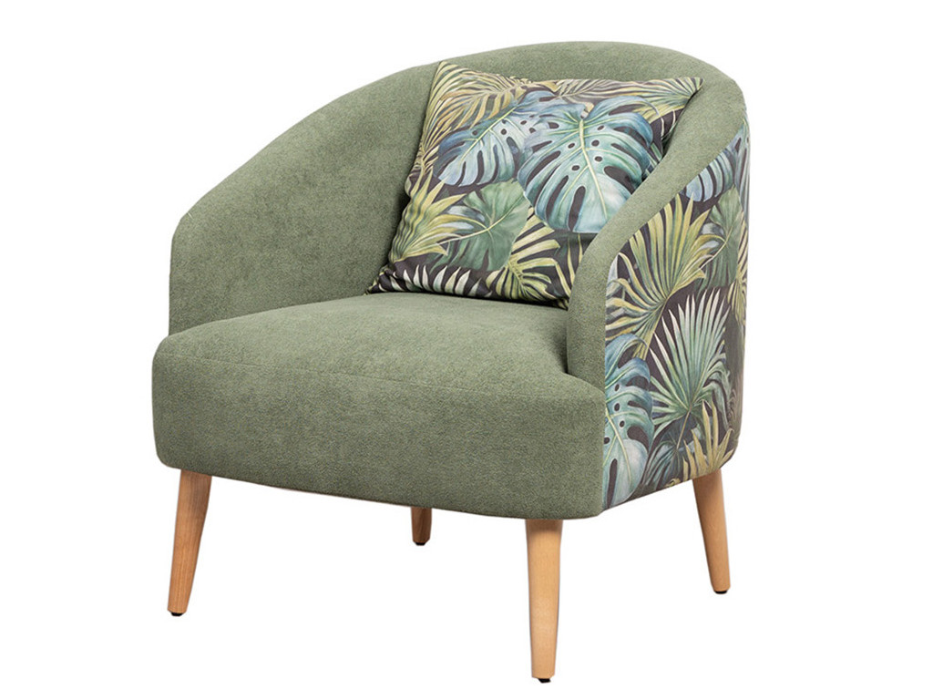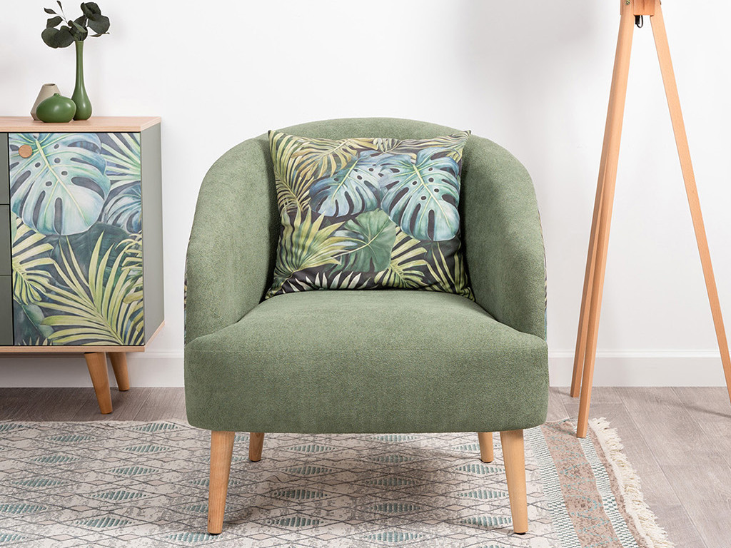 Кресло для отдыха на деревянных опорах. Спинка округлой формы переходящая в боковины. Кресло с подушкой думкой квадратной форы из ткани компаньон.