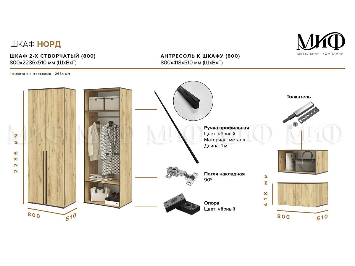 - Шкаф двухстворчатый Норд 800 с антресолью дуб крафт белый МГ