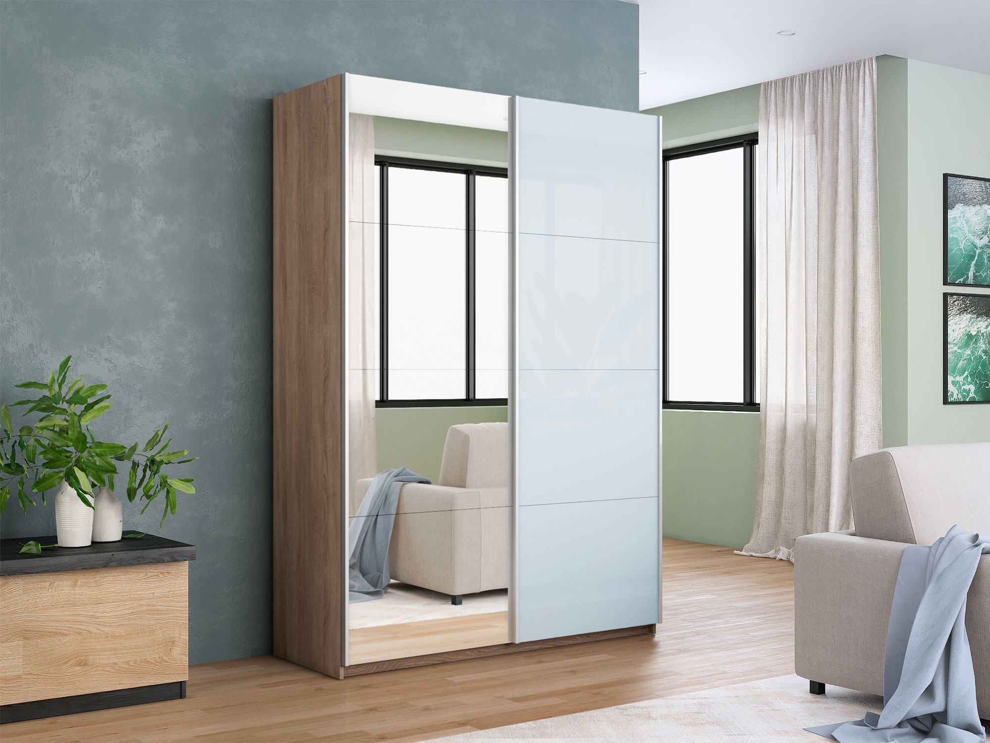 - Шкаф-купе Прайм 2-х дверный 1400 Зеркало/Стекло Белое Сонома